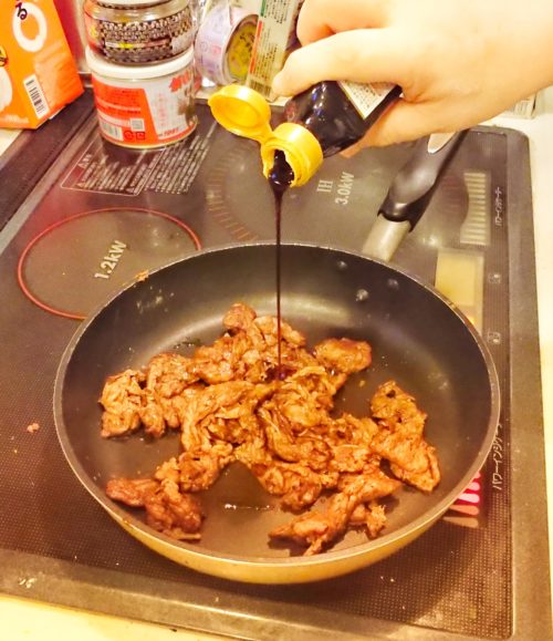 ここで、はじめて ごま油 を加え 肉全体 に油をまわします。